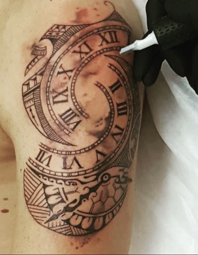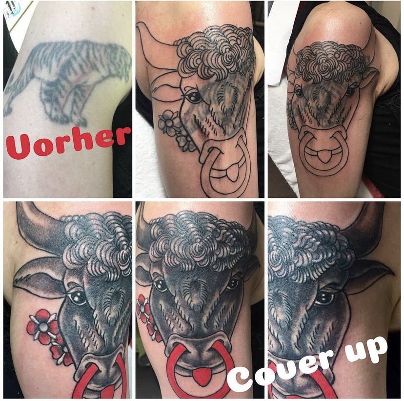 In angenehmen Ambiente geniesst Du Deinen «Stichtag». in einer möglichst bequemen Sitz- oder Liegeposition wird erst die Haut an der entsprechenden Stelle rasiert und desinfiziert und dann wird das Motiv freihändig oder per Matrize auf den Körper übertragen. Sofern das Motiv bezüglich Grösse und Körperstelle perfekt positioniert ist, kann der eigentliche Prozess des Tätowierens beginnen. In der Regel werden die Out Lines zuerst gestochen. Die Tattoofarbe wird dabei exakt in die zweite Hautschicht eingearbeitet. Je nach Körperstelle und Schmerzempfinden wird es mehr oder weniger angenehm werden. Das ist unumgänglich und gehört zum Ritual der Tätowierung. Daher bestimmst Du den Rhythmus und die Pausen, bei der Ausarbeitung Deines ganz persönlichen Kunstwerks mit.